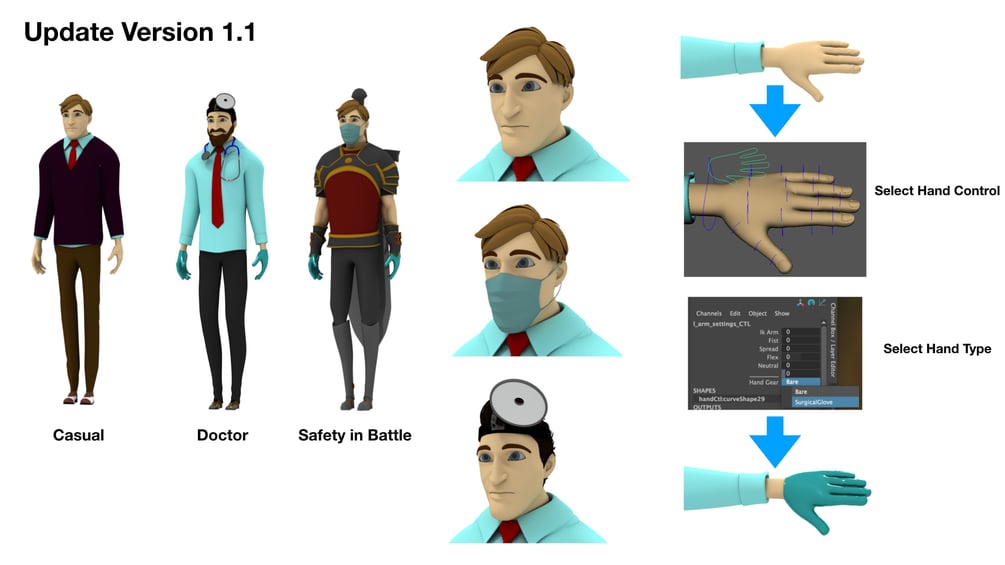 Added two new styles including doctor outfit and casual outfit. Another type of hair found in the head control in addition to a surgeon's mirror. New gloves to hands control. Imported to .ma file. Tested and rendered shots in Maya 2019.2